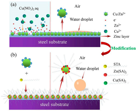 The formation mechanism of the super-hydrophobic process has been studied in this paper. Based on the comprehensive analysis results (SEM/EDS, FT-IR, XRD, XPS), we proposed a possible schematic model to illustrate the formation mechanism of the super-hydrophobic surfaces, as shown in Figure 9. When the Galvanized steel substrate was immersed in the copper nitrate solution, a galvanic replacement reaction between Zn and Cu(NO3)2 occurred (Equation (1)). Zinc ions (Zn2+) were forced to release from the galvanized zinc layer, meanwhile the copper ions(Cu2+) get electrons to form copper and deposited on the substrate. Interestingly, both EDS and XPS results indicate that a large amount of Zn element is detected on the deposited particles. Therefore, we infer that the Zn2+ not completely enter into the solution but remains at the reaction interface between Zn layer and aqueous solution (as shown in Figure 9a). After the galvanic reaction process, the obtained surfaces exhibit super-hydrophilic property, where the water can completely spread (as shown in Figure 9a). When the above-obtained surfaces were modified with STA, the STA molecules combined with the composite particles (Cu/Zn2+), generating zinc stearate (Zn[CH3 (CH2)16 COO]2) and copper stearate(Cu[CH3 (CH2)16 COO]2). In addition, some STA molecules can be attached to the surface of composite particles by physical adsorption (as shown in Figure 9b). Thus the super-hydrophobic surface with micro/nano structures was formed. The detailed reaction equations are described as follows [43]: