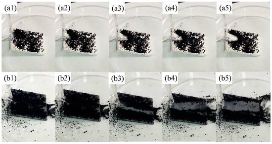 Photographs of the self-cleaning behavior process: (a) the control surface; (b) the super-hydrophobic surface.