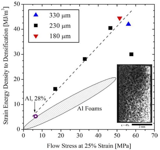The comparison of the plastic energy absorption capacity between the conventional Al foams and the Vit106 metallic glass (MG) foams with pore sizes of 180 µm, 230 µm and 330 µm, where the inset shows an MG foam (pore size 230 µm) at a nominal strain of 4%. Adapted from [] with copyright permission from Elsevier, 2005.