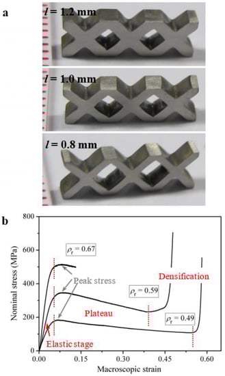 (a) Three cellular MGs with macroscopic cellular structures with varying strut thicknesses. (b) The nominal stress–strain curves of the three cellular MGs with macroscopic cellular structures. Adapted from [] with copyright permission from AIP Publishing, 2014.