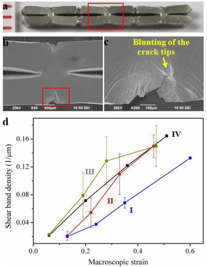 (a) The optical image of a cellular MG after densification, where the original square-shaped pores are nearly eliminated. (b) The SEM image of a deformed node indicated by the red rectangle in (a) at a higher magnification. (c) Blunting effect of the propagation of a crack as indicated by the red rectangle in (b). (d) The evolution of the shear band densities at the nodes of four specimens, I–IV [].