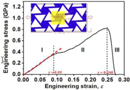 The molecular dynamics (MD) simulation results of an engineering stress–strain curve of the MG-based chiral nanolattice structures, showing a large elastic strain of about 9%, where the inset schematic diagram shows the design of the chiral lattice structure. Adapted from [] with copyright permission from Elsevier, 2017.