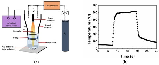 (a) Schematic of APPJ setup; (b) Temperature evolution of substrate during APPJ treatment.