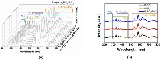 (a) OES evolution during APPJ processing of mixed H2PtCl6/SnCl2 precursors. (b) OES when processing H2PtCl6, SnCl2, and mixed H2PtCl6/SnCl2 precursors using nitrogen APPJ.