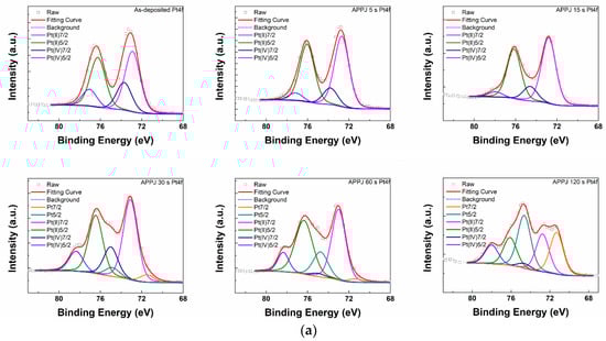 X-ray photoelectron spectroscopy (XPS) spectra of (a) Pt4f and (b) Sn3d for samples processed by APPJ for various durations.
