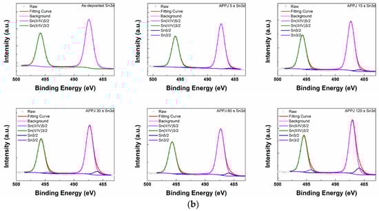 To identify the chemical states of Pt-SnOx compounds, Figure 4a,b shows the XPS spectra of Pt4f and Sn3d for samples. The Pt4f spectrum can be deconvoluted into three components including Pt, Pt2+, and Pt4+. The metallic peaks of Pt are located at 71.30 and 74.65 eV, Pt(II) components are located at 72.70 and 76.50 eV, and Pt(IV) components are located at 73.80 and 77.15 eV [,]. In Figure 4a, the major peaks belong to Pt2+ and Pt4+ for as-deposited and 5 and 15 s APPJ-processed samples. These results indicate that most of the H2PtCl6/SnCl2 precursor was not converted to metallic Pt by APPJ processing for less than 15 s. As the APPJ processing time increases, increased conversion of precursors into metallic Pt was clearly observed. The Pt2+ signal is noted as the oxidation state of Pt, and it could indicate PtO [,] or Pt(OH)2 []. The presence of Pt oxidation states, due to the interaction with the Pt-support, is attributed to an electronic effect or oxygen absorption from air [,]. Figure 4b shows the oxidation state of Sn3d under various APPJ processing times. The binding energy of Sn3d can be deconvoluted into two categories: one at 485.8 and 494.2 eV for the zero-valent state of Sn, and the other at 487.3 and 495.7 eV for Sn(II/IV) components []. The major peak is attributed to the oxidation state of Sn for up to 120 s, and the percentage of metallic Sn increased only slightly increased with the APPJ processing time. Sn(II) and Sn(IV) species are difficult to distinguish from XPS measurements because of the small difference between their binding energies [,]. Table 1 and Table 2 show the percentages of Pt and Sn species, respectively. The Pt-support interaction may influence charge transfer from Pt to oxygen species on the surface and improve the electrochemical catalytic abilities and catalyst stability [].