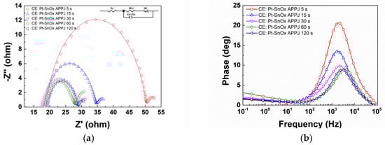 Figure 5a,b shows the EIS Nyquist and Bode phase plots to evaluate the catalytic activities of APPJ-processed Pt-SnOx CEs. The inset of Figure 5a shows the equivalent circuit for Nyquist curve fitting []. The series resistance (Rs) and charge-transfer resistance (Rct) can be described as the resistance of substrates and the catalytic effect of the electrode-reducing triiodide ions, respectively. Rs can be obtained from the high-frequency intercept on the real axis and Rct, from the radius of the real semi-circle []. Table 3 shows the EIS parameters including Rs, Rct, and constant phase element (CPE1) []. A higher catalytic effect and lower charge-transfer resistance would improve the DSSC performance. For all cases, Rs of Pt-SnOx CEs remained similar. Rct generally decreased (i.e., semi-circle became smaller) as the APPJ processing time increased, indicating that APPJ processing can enhance the catalytic activity. Rct was comparable for APPJ processing times of 60 s (4.72 Ω) and 120 s (4.69 Ω). Lower Rct results in a higher electrocatalytic activity at the interface between the CEs and the electrolytes []. CPE1, which represents the interfacial capacitance between the electrode and the electrolyte, is also a good indicator of the surface activity of CEs [,,]. The 120 s APPJ-processed CEs had a higher CPE1-T (105.5 μF/cm2), indicating larger surface reaction between the CE and the electrolyte. Bode phase plots show the electron lifetime for recombination in devices; the electron lifetime is expressed as τe = 1/(2πfpeak), where fpeak is the frequency of the highest peak. Shorter electron lifetime indicates faster charge transfer at the interface between the CE and the electrolyte [,]. In Figure 5b, the trend of the electron lifetime follows the EIS results. The 5 s APPJ-processed CE has the smallest peak frequency, indicating the largest electron lifetime with slower charge transfer. Furthermore, electron lifetimes are comparable in 60 s and 120 s APPJ-processed CEs, and this is consistent with the results for Rct.