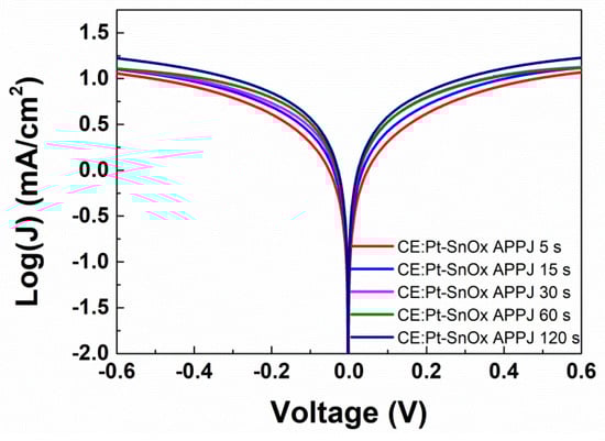 To further clarify the catalytic activities of Pt-SnOx CEs, Tafel polarization experiments were conducted and the results are shown in Figure 6. The exchange current density (J0) was measured by the intercept of the Y-axis (zero voltage) from the tangential line of the curve [,]. The 120 s APPJ-processed CEs had a large J0, indicating better electrocatalyic activity and lower charge-transfer resistance at the interface of the CE and the electrolyte. Table 3 shows that J0 increases with the APPJ processing time. APPJ processes enhanced the triiodide reduction reaction []. The exchange current density is also proportional to Rct obtained from the EIS measurement. It can be described as J0 = RT/nFRct, where R is a gas constant; T is temperature; n is the number of electrons involved in the redox reaction; and F is the Faraday’s constant []. EIS and Tafel measurements both indicate that APPJ-processed Pt-SnOx elecrodes show suitable catalytic performance for use as the CEs of DSSCs. J0 increases with the APPJ processing time, indicating that APPJ processing can enhance the catalyst activity of Pt-SnOx.