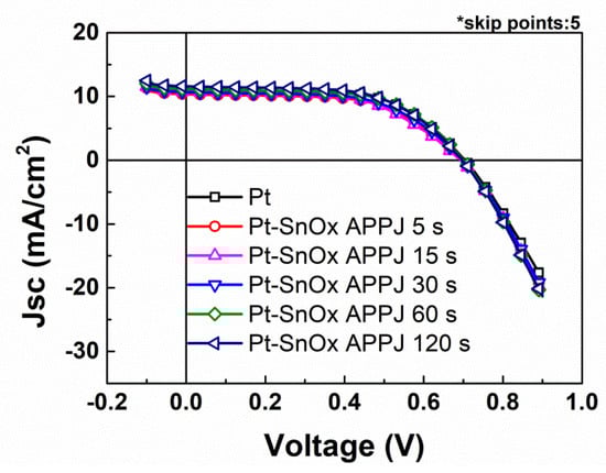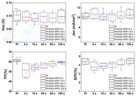 Figure 7 shows the IV curves of DSSCs with APPJ-processed Pt-SnOx CEs. Table 4 shows the photovoltaic parameters, including the open-circuit voltage (Voc), short-circuit current (Jsc), fill factor (FF), and efficiency (EFF) with their standard deviations. The power conversion efficiencies (PCEs) of DSSCs with 5 s and 15 s APPJ-processed Pt-SnOx CEs are 3.87 ± 0.58% and 3.86 ± 0.28%, respectively, indicating that APPJ processing for a short duration can improve the DSSC performance. XPS results show that almost no metallic Pt was converted with 5 s and 15 s APPJ processing, indicating the catalytic effect of oxidized Pt and Sn compound CEs in DSSCs, and this agrees with previous reported findings [,]. As the APPJ treatment time increases, the PCE of DSSCs with 30 s, 60 s, and 120 s APPJ-processed CEs reaches 4.01 ± 0.34%, 4.20 ± 0.41%, and 4.46 ± 0.29%, respectively. The performance of DSSC with a 120 s APPJ-processed Pt-SnOx CE was comparable to that with a conventional furnace-processed Pt CE (4.42 ± 0.26%). Figure 8 shows the statistics of the DSSC parameters. APPJ processing gradually increased the FFs and PCEs of DSSCs, consistent with the results obtained from EIS and Tafel measurement. The improved FF and efficiency with APPJ processing time could result from the better conversion of metallic Pt from the precursor solution.