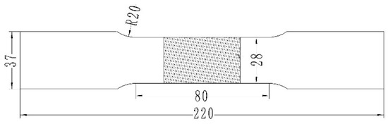 The metallographic specimens, hardness test specimens, and tensile test specimens were cut from the two plates using an electrical discharge machining. The metallographic specimen was 13 × 50 × 4 mm, the hardness specimen was 19 × 80 × 4 mm, and the tensile specimen′s shape is shown in Figure 3. The sampling position of each specimen is shown in Figure 4.