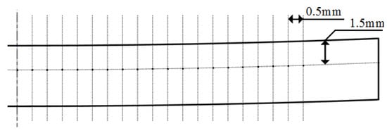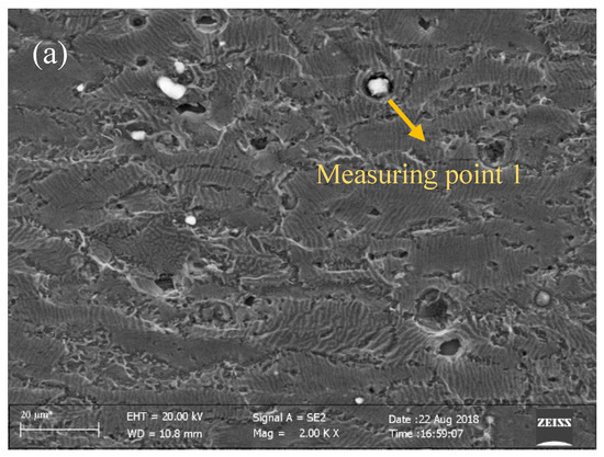 Vickers microhardness was measured under a load of 500 g for 10 s on the cross-section perpendicular to the rectification direction using a THV-1MD automatic testing machine (Yanrun, Shanghai, China). The locations of the microhardness test points are shown in Figure 5. The distance of the row away from the top surface of the plate was 1.5 mm, and the interval between each point was 0.5 mm.