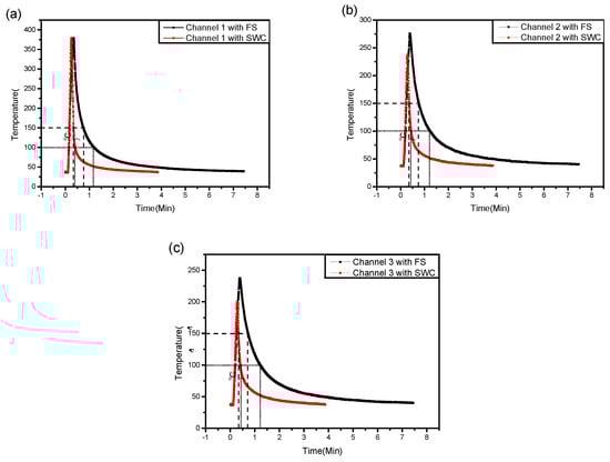 The temperature profiles of each channel were obtained during the flame rectification process to analyze the characteristics of the thermal cycle, as shown in Figure 6. The results showed that the peak temperature decreased with increasing distance from the heating center, so the peak temperature of CH 1 was the highest among the three channels. Compared with the flame straightening, the peak temperatures of CH 2 and CH 3 for SWC were 37 °C and 39 °C lower, respectively; whereas the peak temperature of CH 1 was approximately unchanged. Moreover, compared with flame straightening, the high-temperature dwelling time under SWC substantially decreased. For flame straightening, the dwelling times above 150 °C and 100 °C were 35.8 s and 63 s, respectively; whereas the values under SWC were only 10.9 s and 15.8 s, respectively. The increasing rate of temperature under SWC was the same as that under flame straightening, whereas the cooling rate under SWC was obviously higher than under flame straightening. The time required to reduce the temperature from the peak temperature to room temperature under SWC was less than half of that under flame straightening. All of the aforementioned results clearly indicate that the SWC affected the high-temperature dwelling time.