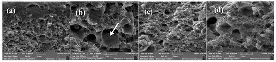 Figure 8 and Figure 9 show the scanning electron microscopy (SEM) fractographs of the fracture surface of the samples under different conditions. Figure 8a,b and Figure 9a,b were close to the rectification surface, Figure 8c,d and Figure 9c,d were near to the bottom of the samples. From the macroscopic view, the fracture surface appeared to be fibrous, and the whole section was at an angle of 45° to the principal stress [14]. The fracture surfaces of the samples of the two states were covered with equiaxed dimples of various sizes. The typical dimples of the fracture surfaces indicated that the fracture morphology was a ductile feature. Because the growth rate of micropores was significantly changed under normal stress along three directions without uniaxial tension, and a large number of equiaxed dimples were produced [15] (Figure 8 and Figure 9a,c). After magnifying 5000 times, these marks were snakelike slippages (Figure 8 and Figure 9b). It can be seen that the small dimples crowded around the large dimples from the fracture morphology of the sample with SWC, and the fracture morphology of the sample with flame straightening, were relatively uniform in size, but larger and shallower. Since the dimple size is related to the spacing of the second phase particles, the increase in the dimple can be explained by the increased distance of the second phase and the dispersed distribution. There was little difference between the fracture morphology (Figure 8 and Figure 9c,d); though the bottom was far from the flame straightening surface, the degree of heat affected was less.