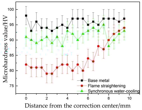 Figure 10 depicts the microhardness profiles of the samples under different states as well as the base metal. It can be seen that the microhardness of the two states were lower than that of the base metal. However, the microhardness of the SWC was closer to that of the base metal, and its average only decreased by 4.4 HV, whereas the flame straightening was 11.6 HV lower than that of the base metal on average. Compared with the two states, the microhardness of the specimen with flame straightening had a large gradient, and its average was about 7 HV lower than that of the SWC.
