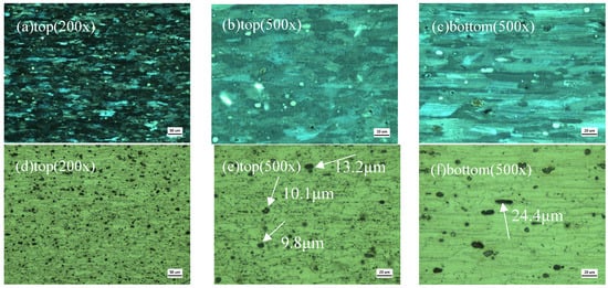 Under SWC, the microstructure appeared similar to the original, with an elongated grain structure presented. The change in the grain shape in the thickness direction was not obvious (Figure 12a–c). It can be considered that the grains did not grow significantly. The small amount of β (Mg5Al8) precipitates (the black precipitate indicated by the arrow) appeared in the matrix [16], and the size of the precipitate phases was mostly small (Figure 12d–f). This effect is shown in Figure 12e. After SWC, the precipitates were smaller and more dispersed. The measured data showed that the average size of the precipitates at the bottom was about 25 μm, and the average size of precipitates after SWC was about 13 μm.