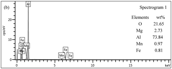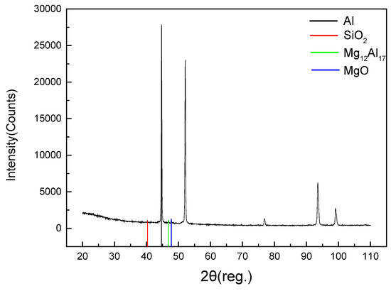 In order to identify the type of precipitates and enhance the identification provided by the literature, SEM analysis was performed. The results are shown in Figure 14 and Figure 15. The composition of the precipitated phases in the two states was the same, but the mass percentage of each component was different. Therefore, the precipitation was consistent. The existence of oxygen was due to the electrochemical polishing of specimens. The other elements may be constituents of the precipitates because the SEM only determined the composition of the precipitates and could not accurately obtain the phase results. X-ray diffraction (XRD) was used to analyze the phases. As shown in Figure 16 and Figure 17, the types of precipitates were consistent, and the ratio of magnesium and aluminum was 12:17.