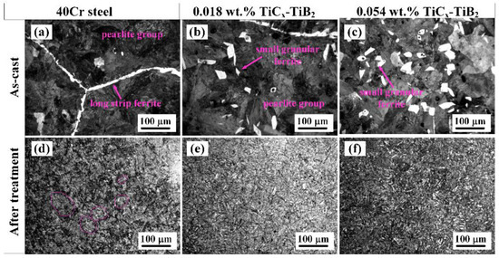 OM images of the as-cast steels (a–c), and steels after heat treatment (d–f).