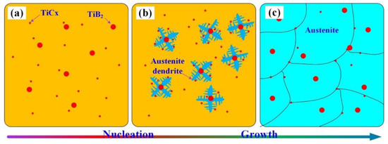 The effect of TiCx-TiB2 nanoparticles on the refinement of austenite. (a) Nanoparticles in molten steel; (b) Nucleation and growth of austenite; (c) Nanoparticles in austenite.