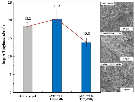 Figure 9 shows the impact properties and impact fracture morphologies of the steels with different contents of TiCx-TiB2 nanoparticles at room temperature. The impact toughness of steel with 0.018 wt.% TiCx-TiB2 nanoparticles is 11.5% higher than that of the 40Cr steel, but the impact toughness of the steel with 0.054 wt.% nanoparticles is reduced. Some of the reasons for this can be seen from the impact fracture surfaces in Figure 9. In the impact fracture surfaces of the 40Cr steel, the quasi-cleavage transgranular fracture is dominant, and there is a small intergranular fracture section. Except for a small amount of cleavage fracture, there are many dimples on the impact fracture of the steel with 0.018 wt.% TiCx-TiB2 nanoparticles, indicating that the impact toughness is better than that of the 40Cr steel. The fracture of the steel with 0.054 wt.% TiCx-TiB2 nanoparticles is dominated by brittle intergranular fracture and some cracks, which are unfavorable for the toughness of the material.