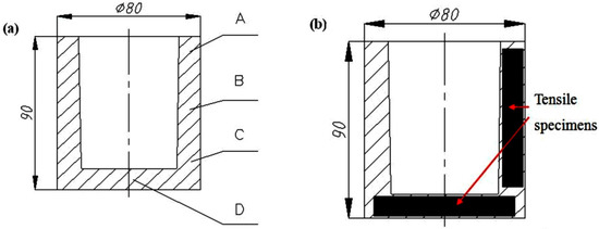 Sampling schematic diagram of the (a) microstructural specimens and (b) the tensile specimens.