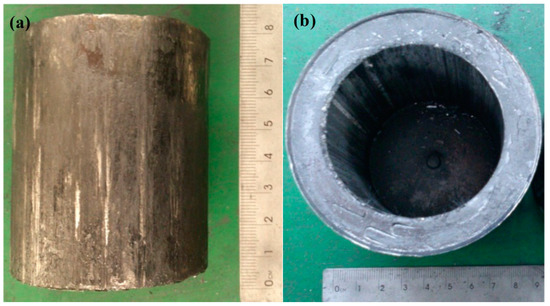 Wrought 7075 aluminum alloys supplied by Northeast Light Alloy Co. Ltd. of China (Harbin, China) were used as matrix material of the composite. Its chemical composition was analyzed with an Axios pw4400 X-ray fluorescence spectrometer (PANalytical B.V., Almelo, The Netherlands) and contained 6.0 wt% Zn, 2.3 wt% Mg, 1.56 wt% Cu, 0.26 Si wt%, 0.27 wt% Mn, 0.17 wt% Cr, 0.03 wt% Ti and balance of Al. Nano-sized SiC particles with an average size of 80 nm were used as reinforcement of the composite. It was supplied by Xuzhou Jiechuang New Materials Co. Ltd. of China (Xuzhou, China). The solidus of 546 °C and liquidus of 637 °C temperatures were determined by using a Differential Thermal Analyzer (Mettler-Toledo, Zurich, Switerland) [41]. Solid fractions at various temperatures were obtained by integrating the data of the differential scanning calorimetry (DSC) converted from DTA data [36]. The 7075 aluminum alloy was first melted at 650 °C via a molybdenum crucible placed in a resistance furnace. In order to compensate for the loss of Mg element due to evaporation or formation of Mg oxides, a small pure Mg ingot accounting for 0.2 wt% of the total weight of 7075 alloy was added into the melt. The melt was held isothermally for 10 min. Then nano-sized SiC particles were added into the melt of 7075 alloy. The melt with nano-sized SiC particles was treated for 20 min via a 2 kw ultrasonic device at a frequency of 20 kHz. After that, the 7075 alloy with nano-sized SiC particles was stirred continuously with a molybdenum stirrer when it was cooled from 650 °C (above the liquidus temperature) to 620 °C (a given semisolid temperature). When the 7075 alloy with nano-sized SiC particles was cooled to 620 °C, it was stirred isothermally for 20 min to fabricate a semisolid slurry of composite. The semisolid billet of nano-sized SiCp/7075 composite was fabricated by rheoforming the semisolid slurry via a 2000 kN hydraulic press and a die with a preheated temperature of 300 °C [41]. Figure 1 shows the macrograph of the fabricated semisolid billet of the nano-sized SiCp/7075 composite. Thixoforming experiments were carried out on a designed die with a preheating temperature of 400 °C. The die schematic diagram and real product for the thixoforming cylinder part were given in the previous research of Jiang et al. [42]. The applied load and pressure-holding time during the thixoforming process were 2000 kN and 10 s, respectively. Three groups of thixoforming experiments were performed. In the first group, semisolid billets soaked for 5 min, 10 min, 15 min, 20 min, and 25 min respectively were thixoformed at 580 °C. In the second group, semisolid billets soaked for 5 min, 10 min, 15 min, 20 min, and 25 min respectively were thixoformed at 600 °C. In the third group, semisolid billets soaked for 10 min were thixoformed at 580 °C, 590 °C, 600 °C, and 610 °C, respectively.