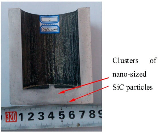 Figure 3 shows the macrograph of the thixoformed part of the nano-sized SiCp/7075 composite. As indicated in Figure 3, a cylinder part was thixoformed successfully due to good filling ability of the semisolid billet. Good surface quality was observed in the thixoformed part. A half-sectional macrograph is shown in Figure 4. As shown in Figure 4, the macrostructure of the thixoformed part is very dense and no obvious porosity was found in the macrostructure. In addition, it is noticeable that slight clusters of nano-sized SiC particles are found in the macrostructure. It illustrates that absolutely perfect dispersion of the nano-sized SiC particles in the 7075 alloy matrix is very difficult to obtain although transient cavitation and acoustic streaming created by an ultrasonic wave and high and controllable viscosity of the semisolid slurry can disperse the nano-sized SiC particles effectively. Therefore, some slight clusters were found in the matrix due to large Van der Waals forces and electrostatic forces between the nano-sized SiC particles (Figure 4).