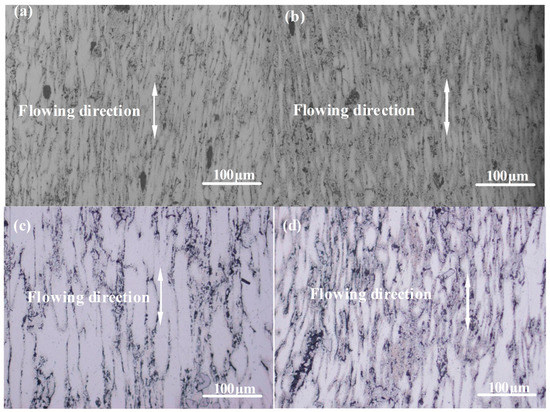Figure 6 shows the OM microstructure in location B of the thixoformed parts of the nano-sized SiCp/7075 composite soaked for 10 min at different remelting temperatures. As indicated in Figure 6, the solid grains are elongated obviously along the flowing direction. The grain size of the thixoformed part slightly changes when the remelting temperature increases from 580 °C to 590 °C. However, the grain size of the thixoformed part increases obviously when the remelting temperature is elevated to 600 °C. This is due to the fact that elevated remelting temperature leads to coarsening of the microstructure of the semisolid billet during the remelting process. Therefore, the coarsened solid grains remain in the microstructure of the thixoformed parts. Grain size decreases upon remelting at a temperature of 610 °C. The coarsening trend and melting trend together influence the grain size of the semisolid billet during the remelting process [46]. When the remelting temperature is 610 °C, the melting trend is dominant. Therefore, this leads to a decrease of grain size of the semisolid billet during the remelting process. After the semisolid billet was thixoformed, the grain size of the thixoformed parts slightly decreased. On the whole, the size of the solid grains in the semisolid slurry exhibits first an increase, followed by a decrease with increasing remelting temperatures. This was attributed to the double effect of coarsening trend and melting trend caused by increasing the remelting temperatures. In addition, it is also noticeable that nano particles are slightly clustered in Figure 5 and Figure 6. This was attributed to large Van der Waals force and electrostatic force between nano-sized SiC particles. Therefore, absolutely homogeneous dispersion of nano-sized is not possible to obtain due to the large Van der Waals and electrostatic forces between the nano-sized SiC particles.