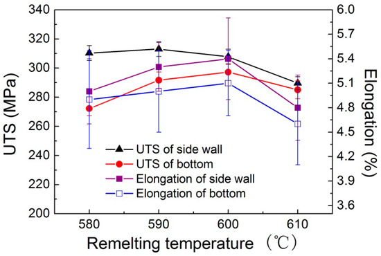Figure 7 shows the mechanical properties of the thixoformed parts of the nano-sized SiCp/7075 composite soaked for 10 min at different remelting temperatures. As indicated in Figure 7, the ultimate tensile strength (UTS) of the side wall of the thixoformed part only slightly increases when the remelting temperature increases from 580 °C to 590 °C. However, the UTS decreases gradually upon further increase of the remelting temperature. The highest UTS of 313 MPa was obtained at a remelting temperature of 590 °C. The highest elongation of 5.4% of the thixoformed part was achieved at a remelting temperature of 600 °C. It can be noted that the UTS and elongation of the side wall of the thixoformed part are higher than those at the bottom of the thixoformed part. As to the mechanical properties at the bottom of the thixoformed parts, the highest UTS and elongation of the thixoformed parts were achieved at a remelting temperature of 600 °C. According to the UTS and elongation of the thixoformed parts, the optimal remelting temperatures should be 590 °C and 600 °C.