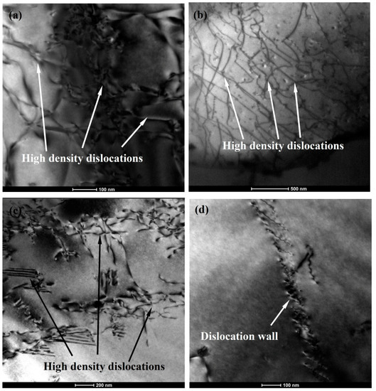 Figure 8 gives evidence of the dislocations created in the thixoformed composite parts at different remelting temperatures. More dislocations were created due to large deformation, which can improve the UTS by hindering grain sliding. As shown in Figure 8, a large amount of high density dislocations were found in the microstructure of the thixoformed composite parts at 580 °C, 590 °C, and 600 °C. An obvious dislocation wall was created in the microstructure of the thixoformed composite part at 610 °C. This was attributed to dynamic recovery occurring in the deformation process, leading to a decreased dislocation density. It is also consistent with the decreased UTS of the thixoformed composite at 610 °C (Figure 7). Especially, high density dislocations were noted in the thixoformed composite at 590 °C. This illustrates that the highest UTS of the side wall was obtained at 590 °C. Furthermore, as shown in Figure 6, the deformation degree of the thixoformed part at 590 °C is larger than those at 580 °C, 600 °C, and 610 °C. In addition, fine grains also improve the UTS of the thixoformed part according to the Hall–Petch effect [47].
