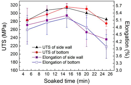 The microstructure of the thixoformed part soaked for different times at 600 °C is presented in Figure 9. As indicated in Figure 9, a large number of elongated grains were found in the microstructure. Furthermore, the elongated extent of the solid grains with a soaking time of 15 min is the largest, illustrating the largest deformation degree. This led to improvement of UTS and elongation of the thixoformed part (see Figure 10). Therefore, the highest mechanical properties of the thixoformed part are achieved with a soaking time of 15 min. When the soaking time is 20 min and 25 min, obvious liquid phase segregation was found in the microstructure, which led to a reduction of mechanical properties. Unlike the mechanical properties of the thixoformed part with elevated remelting temperature, no obvious regulation was found in the mechanical properties of the thixoformed part soaked for different times at 600 °C.