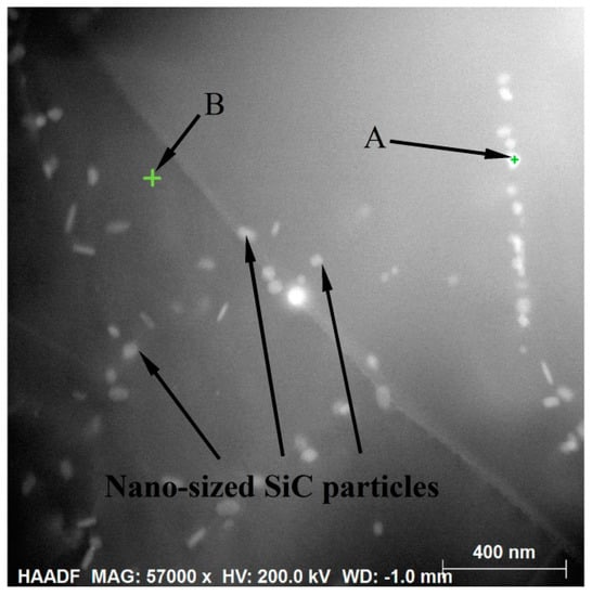 High-resolution TEM micrograph and EDX results are presented in Figure 12. Table 2 and Table 3 exhibit the elements in locations A and B. As indicated in Table 1, the phase contains C and Si elements, implying the existence of nano-sized SiC particles. However, the matrix phase (α-Al) does not contain Si element. As shown in Figure 12, nano-sized SiC particles are distributed uniformly in the microstructure. It also illustrates that the ultrasonic-assisted semisolid stirring method is suitable for fabricating a semisolid slurry of the nano-sized SiCp/7075 composite.