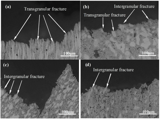 Figure 14 shows the OM images of the fracture of the bottom of thixoformed part soaked for 10 min at different remelting temperatures. The fracture type of the thixoformed part at 580 °C is transgranular fracture (Figure 14a). Intergranular fracture and transgranular fracture occurred together in the thixoformed part at 590 °C (Figure 14b). When the remelting temperature is elevated to 600 °C and 610 °C, obvious intergranular fracture was found in the fracture macrograph (Figure 14c,d). This is due to the effect of increasing liquid film thickness and liquid segregation. When the remelting temperature is elevated, increased liquid fraction leads to an increase of liquid film thickness and liquid segregation. The strength in the areas of the liquid film and liquid segregation is lower than the solid grain’s strength, resulting in easier occurrence of fracture compared with solid grains.
