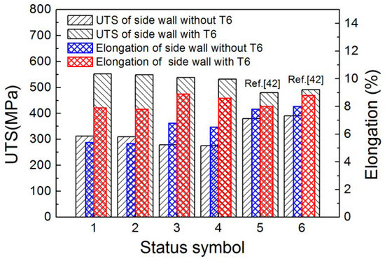 Figure 15 gives the effect of T6 treatment (i.e., solid solution and artificial aging) on the mechanical properties of the rheoformed composite parts, the thixoformed composite parts, and the thixoformed 7075 aluminum alloy parts. As shown in Figure 15, the mechanical properties were improved significantly after the thixoformed composite parts were treated by T6. The UTS and elongation of the side wall of the thixoformed part without T6 were 313 MPa and 5.4%, respectively. After the thixoformed parts were treated by T6, the UTS and elongation of the side wall were improved to 552 MPa and 7.9%, respectively. The UTS of the thixoformed composite part with T6 was 76.4% higher than that of the thixoformed composite part without T6. The elongation of the thixoformed composite part with T6 was 46.3% higher than that of the thixoformed composite part without T6. The UTS of the bottom of the thixoformed part was increased from 310 MPa to 549 MPa. The elongation increased from 5.3% to 7.8%. The extents of increase were 77% and 47.2%, respectively. The UTS of the thixoformed parts with and without T6 was improved compared to the thixoformed parts of 7075 aluminum alloy with and without T6 due to the addition of nano-sized SiC particles. The increasing dislocation density created by the coefficient of thermal expansion (CTE) mismatch between the matrix and nano-sized particles enhances the strength of the composite [48]. The obstacle of uniformly distributed SiC particles to the movement of dislocation also plays an important role in the improvement of strength according to the Orowan mechanism [49]. In addition, the improvement of strength of the thixoformed parts could be related to the fracture toughness of the interface between the nano-sized SiC and the Al matrix. The pillar splitting technique as reported by Matteo Ghidelli et al. could provide a feasible method to measure the fracture toughness [50]. The elongation of the thixoformed parts with and without T6 was reduced compared with the thixoformed parts of 7075 aluminum alloy with and without T6. The UTS of the thixoformed parts without T6 is less than that of the rheoformed parts without T6 [42]. However, the UTS of the thixoformed composite parts with T6 is even more than that of the rheoformed composite part with T6. The elongations of the thixoformed composite parts with and without T6 were less than those of the rheoformed composite part with and without T6.