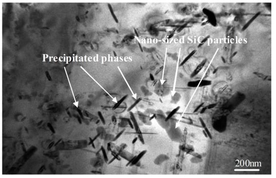 In addition, T6 treatment can make phase (MgZn2) precipitate uniformly in the matrix, as shown in Figure 16. Some long striped η phases (MgZn2) were also found in the TEM micrograph (Figure 16). These η phases (MgZn2) were dissolved in the 7075 alloy matrix after the thixoformed composite parts were solution treated for 6 h at 465 °C. They formed a supersaturated solid solution of α Al when the solution treated thixoformed parts were quenched. These η phases (MgZn2) precipitated uniformly in the 7075 alloy matrix. The uniformly dispersed η phases strengthen the alloy, leading to improvement of the mechanical properties.