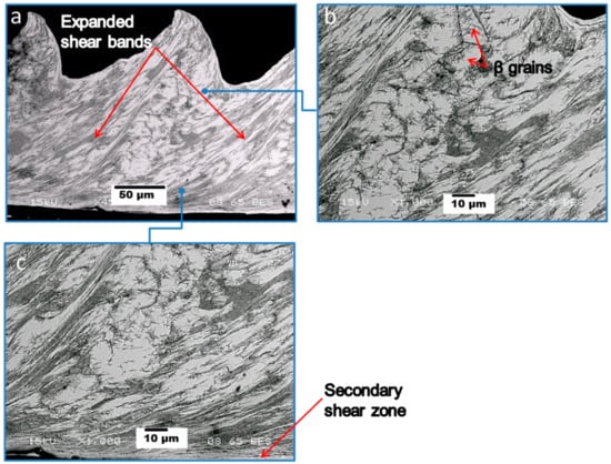 - High levels of deformation in the primary shear zone promote extensive refinement of the β phase within expanded shear band regions approximately 100 µm in width to almost equiaxed grains with sizes below 100 nm in regions of intense deformation, while α phase laths frequently occupy the grain boundaries aligned to the shear direction. There is a transition to firstly elongated β grains and then to larger diamond-shaped β grains in adjoining regions of less intense deformation. The presence of a high density of α phase laths across the entire expanded shear band region suggests that temperatures in this region are likely in the range of 400–600 °C during cutting.