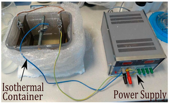 Before undertaking the zinc electroplating process, all steel screws were subjected to a standard zinc phosphating process. This was done to provide a foundation for improvement of the adhesion of the coating to be applied to steel parts. Then, each of the phosphate screws was weighed on a precision balance to determine its initial mass prior to application of the zinc coating. The zinc electroplating process was then carried out in an isothermal container that was connected to an adjustable heater, into which each proposed solution was poured. These solutions were proposed based on zinc concentration (C), sodium hydroxide concentration, additive concentration 1 (CA1; Envirozin Conditioner), and additive concentration 2 (CA2, Envirozin 100 Initial Brightener). The positive pole of the power supply was connected to a pure zinc plate that served as a cathode. The negative pole was connected to the already phosphated steel screws, which served as the anode. Once the temperature of the previously proposed solution had been reached, each of the screws was completely immersed in this specific solution. Next, the power supply was connected and the values of intensity and voltage for the deposition of the proposed zinc coatings were adjusted until the values of the proposed current densities (ρ) were reached. The current density values were obtained from the current provided by the power source and from the surface of the screw. The current was measured using the power supply’s ammeter, whereas the surface of the screws was obtained theoretically using Catia v5 R18 (Woodlands Hills, CA, USA) [34]. However, for the purpose of always keeping the exposed surface of the screws unchanged, the position of the screws inside the isothermal container was also left unchanged, as well as the distance between the cathode and the anode. Figure 2 shows the proposed installation of the zinc electroplating of the phosphate screws.