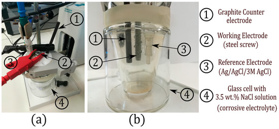 After the time (t) for the deposition of the coating had elapsed, the power supply was disconnected, and the zinc-plated screw was withdrawn from the solution and then submerged in pure water to remove the dissolution residues from its surface. Then, the zinc-plated screw was immersed for 30 s in a passivating product (TRIPASS ECO 3) and subsequently immersed for 60 s in a sealant product (Hydroklad 30). After the zinc-plated screws that had been treated with the passivant and sealant were completely dry, they were weighed again on the precision scale. The difference in masses between the phosphate and galvanized screws was the coating mass increase (ΔM). The coating thickness measurement (Th) was conducted by means of a nondestructive technique that is based on the magnetic induction phenomenon and is in accordance with ASTM B499-09 [35]. A measuring device Minitest (Model 1100, Elektrophysik, Cologne, Germany) that was equipped with an FN 1.6-type probe was selected in this case for use when dealing with zinc coatings on steel substrates. The measurement of the coatings was made at four different points on each of the galvanized screws and an average value of the coatings was subsequently calculated. In order to validate and adjust this method of measuring the thickness, the thickness of the coatings of several of the zinc-plated steel screws was measured by means of destructive tests based on metallographic methods according to the ASTM E3-95 standard [36]. The corrosion resistance of all samples obtained by the zinc electroplating process was evaluated by taking electrochemical measurements using a potentiodynamic polarization technique [37]. Open-circuit potential (OCP) measurement and linear potential scan experiments were chosen as the electrochemical measurement methods. The measurements were conducted using an AUTOLAB-PGSTAT computer-controlled potentiostat (Metrohm, Herisau, Switzerland) in a naturally aerated 3.5 wt. % NaCl solution at room temperature. For this purpose, a conventional three-electrode cell was used with a graphite bar as counter electrode, an Ag/AgCl/3 M KCl electrode as reference electrode, and the specimen (steel screw) as a working electrode [38,39,40,41,42]. A glass cell containing 150 mL of 3.5 wt. % NaCl solution (corrosive electrolyte) was used for each electrochemical experiment. Figure 3a shows the connections made to each of the electrodes while Figure 3b shows the placement of each of the electrodes inside the glass cell.