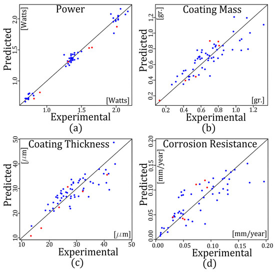 After the errors in the prediction from the regression models of the training and testing data were made, a scatter diagram of the variables was created. Figure 5 shows the scatter diagram or relationship of the experimental values to the values that had been predicted (quadratic models) for W, ΔM, Th, and R. The blue points correspond to the 54 datapoints shown in Table 2, whereas the red points correspond to the six additional zinc-coated steel screws that were used in the regression models that appear in Table 8. In this case, if the variables are correlated, the points will fall along the diagonal line or curve. The better the correlation, the tighter the points will hug the line. The figures indicate that all the red dots (or test data) are closer to the diagonal line than are some of the blue dots (or training data). Therefore, their correlation is greater. Because the number of test datapoints is less than the number of training datapoints, the MAE and RMSE errors for the testing analysis and the training analysis are similar (see Table 8 and Table 9). However, the variables that had the greatest correlation were W and ΔM, whereas the variables that had the lowest correlation were Th and R. The reason for this may be that the procedure to obtain these variables is more complex than the one to obtain W and ΔM, and, therefore, the error may be greater. As a result of the figures and the errors shown in Table 8 and Table 9, it can be said that these models suffice for the prediction of such values, as the residuals were small and the correlations of actual to predicted values were high.