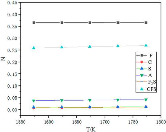 To consider the effect of temperature on the activity of FeO (NFeO), NFeO was calculated in the different slags shown in Table 3 and at a temperature range of 1573–1823 K. The results are shown in Figure 2. It was found that NFeO in the two slags increased slightly with increased temperature. Figure 3 shows the activity of some components in slag 2 at different temperatures. F, S, C, and A represent FeO, SiO2, CaO, and Al2O3, respectively.
