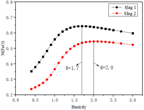 To calculate the effect of basicity on NFeO, the contents of Al2O3 and FeO were kept constant at 7.61% and 43.36% in slag 1, respectively. In slag 2, the contents of Al2O3 and FeO were 11.90% and 33.68%, respectively. From Figure 2, it can be seen that temperature had little effect on NFeO, thus the study was carried out at 1723 K, and basicity was used with binary basicity R = w(CaO)%/w(SiO2)%. The results are shown in Figure 4, indicating that the tendency of NFeO was the same with different contents of Al2O3 and FeO. NFeO first increased slightly, then increased sharply, and finally decreased. In slag 1, the maximum activity was 0.64 at basicity of 1.7, while the maximum was 0.55 in slag 2 with basicity of 2.0. From Table 2, it can be seen that ∑n, the sum of moles of ions and molecules in the slag system, decreased because of the reactions between CaO and SiO2. According to the equation NFeO = 2xFeO/∑n, NFeO would increase as the reactions between CaO and SiO2 proceed. On the other hand, FeO would react with CaO, Al2O3, or SiO2, which would decrease the content of FeO. Since these two are opposite factors, the activity of FeO would appear at the maximum value.