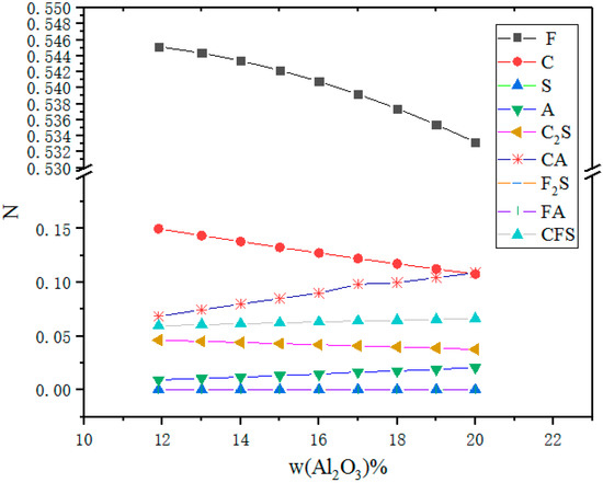 From Figure 8, it can be seen that the value of the activity of FA (FeO·Al2O3) is very small, just like the value of the activity of S (SiO2). Although the activity of FeO·Al2O3 increased with increased Al2O3 content, the value of activity of FeO·Al2O3 was so small to be ignored, which means it is hard for Al2O3 to react with FeO in this slag system. On the other hand, the activity of CaO·Al2O3 increased, indicating that the Al2O3 reacted with CaO and decreased its activity. With such a decrease, it is difficult for CaO to replace FeO from 2FeO·SiO2, which decreases the NFeO [24]. CaO can only react with 2FeO·SiO2 to form CaO·FeO·SiO2, as in Equation (10). Therefore, the activity of 2CaO·SiO2 decreases and the activity of CaO·FeO·SiO2 increases when the content of Al2O3 increases.