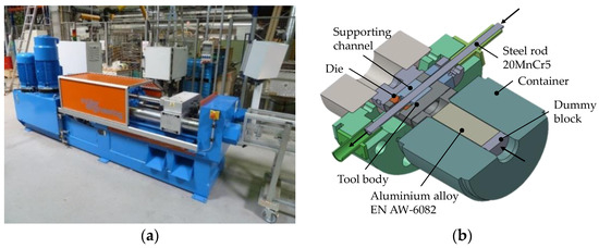 Figure 1. (a) 2.5 MN extrusion press (Müller engineering GmbH, Todtenweis, Germany); (b) Longitudinal section of LACE tool and container.