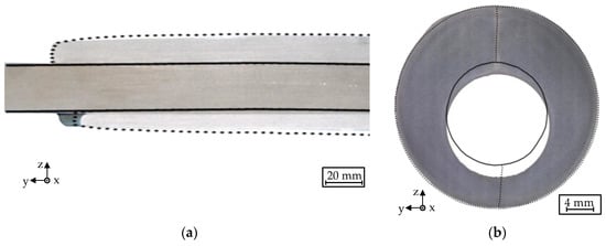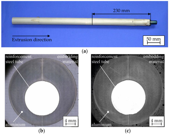 An exemplary hybrid profile obtained in the experiments with a ram speed of 2 mm·s−1 and an extrusion ratio of 6:1 is shown in Figure 3a. Although a flat and even profile surface without visible cracking or failure was achieved, slight variations of the outer diameter could be observed.