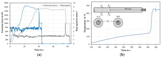 Figure 4. (a) Extrusion force-time diagrams and ram speed-time diagrams obtained experimentally at an average ram speed of 2 mm·s−1 (grey) and 4 mm·s−1 (blue); (b) Experimentally measured temperature of the steel rod for a ram speed of 2 mm·s−1 with schematically displayed position of the thermocouple (TC).