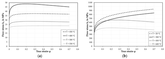 Figure 5. Flow curves at a strain rate of 1 s−1 for various temperatures of (a) EN AW-6082 and (b) 20MnCr5.