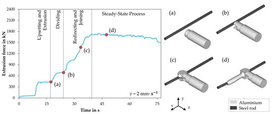 Figure 6. Extrusion force-time diagram with highlighted process steps and numerical modelling of the material flow during the co-extrusion of aluminum and steel: (a) upsetting and extrusion; (b) dividing into two material streams; (c) filling of the tool, redirection and joining; (d) forming and steady material flow.