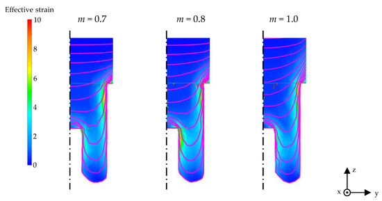 Tresca’s friction law was used to describe the frictional behavior between the aluminum billet and tool. The friction value was varied between 0.7 and 1.0 to determine the best correlation in comparison with the experimental results. In Figure 7, the influence of the friction value on the material flow inside the container and the upper part of the tool is shown. As the friction value increased, the aluminum was more stuck to the tool, which is illustrated by the highlighted flow lines. This also caused the characteristic shear zone near the first forming stage to increase.