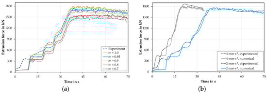 Figure 8. (a) Numerically predicted force-time curves for different friction values; (b) Comparison of numerically predicted and experimentally measured force-time curves for ram speeds of 2 mm·s−1 and 4 mm·s−1 (m = 0.95).