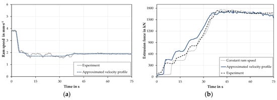 Figure 9. (a) Measured and approximated ram speed-time curve; (b) Extrusion force-time curve for a temperature of 480 °C, an extrusion ratio of 6:1 for constant and approximated ram speed.