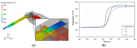 Figure 10. (a) Calculated temperature distribution during extrusion and highlighted temperature measurement points T1–T3; (b) Comparison of the calculated temperature curves at measurement points T1–T3 with the experimental results.